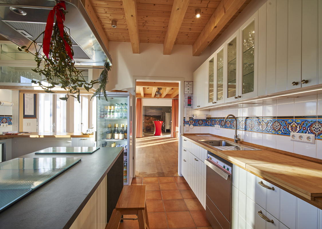 Die Ausstattung der Event-Räume ist ebenso ansprechend wie zweckmäßig: Helles Holz aus regionaler Produktion, spanische Kacheln, professionelles technisches Equipment, moderne Küche und Toilette.